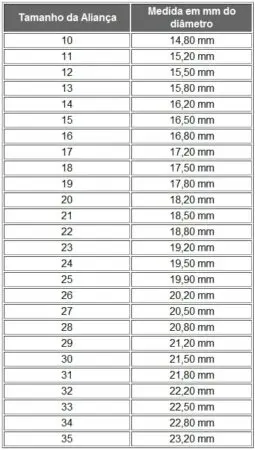 | Tamanho do Anel | Medida em cm | Tamanho do Anel | Medida em cm | Tamanho do Anel | Medida em cm |
