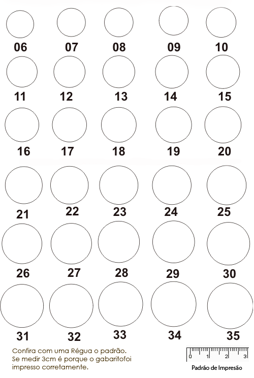 1. Imprima o modelo abaixo com os tamanhos dos aros, para isso clique sobre a imagem com o número das alianças; 2. Pegue um anel que lhe sirva e que seja referente ao dedo que deseja usar a aliança; 3. Coloque o anel sobre os aros da folha impressa; 4. A parte de dentro do círculo do seu anel deverá ficar exatamente em cima do círculo interno do anel impresso, onde as setas serão o limite. 5. Feito esse processo, é só ver o seu número correto de aro e nos enviar.Após imprimir a imagem abaixo com os aros é importante que você confira se o risco abaixo mede realmente 2cm, se não tiver exatamente 2 cm é porque a ficha com os aros foi impressa de forma incorreta com a resolução menor ou maior, neste caso não use esse método. Não coloque o anel ou aliança sobre o monitor, pois o tamanho que aparece em sua tela não coincide com o tamanho real, é necessário imprimir a imagem. Este é um método que possui chances de erro se não for feito corretamente, por isto tome muito cuidado, a informação correta de seu aro é de sua responsabilidade.